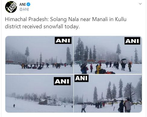 मनाली एक महीने बाद बर्फ के फाहों से सराबोर हुई है। हालांकि मनाली में एक इंच ही बर्फ़ बारी हुई लेकिन आसपास के क्षेत्रों में अच्छी बर्फ़बारी हुई है। पर्यटन स्थल सोलंगनाला, फातरु, अंजनी महादेव, कोठी, गुलाबा व हामटा में पिछले तीन दिनों से रुक-रुक कर बर्फ़बारी हो रही है। सोलांग व गुलाबा में 4 इंच से अधिक बर्फ़बारी हुई है। इन दिनों मनाली आ रहे सैलानी बर्फ के फाहों का आनंद उठा रहे है।